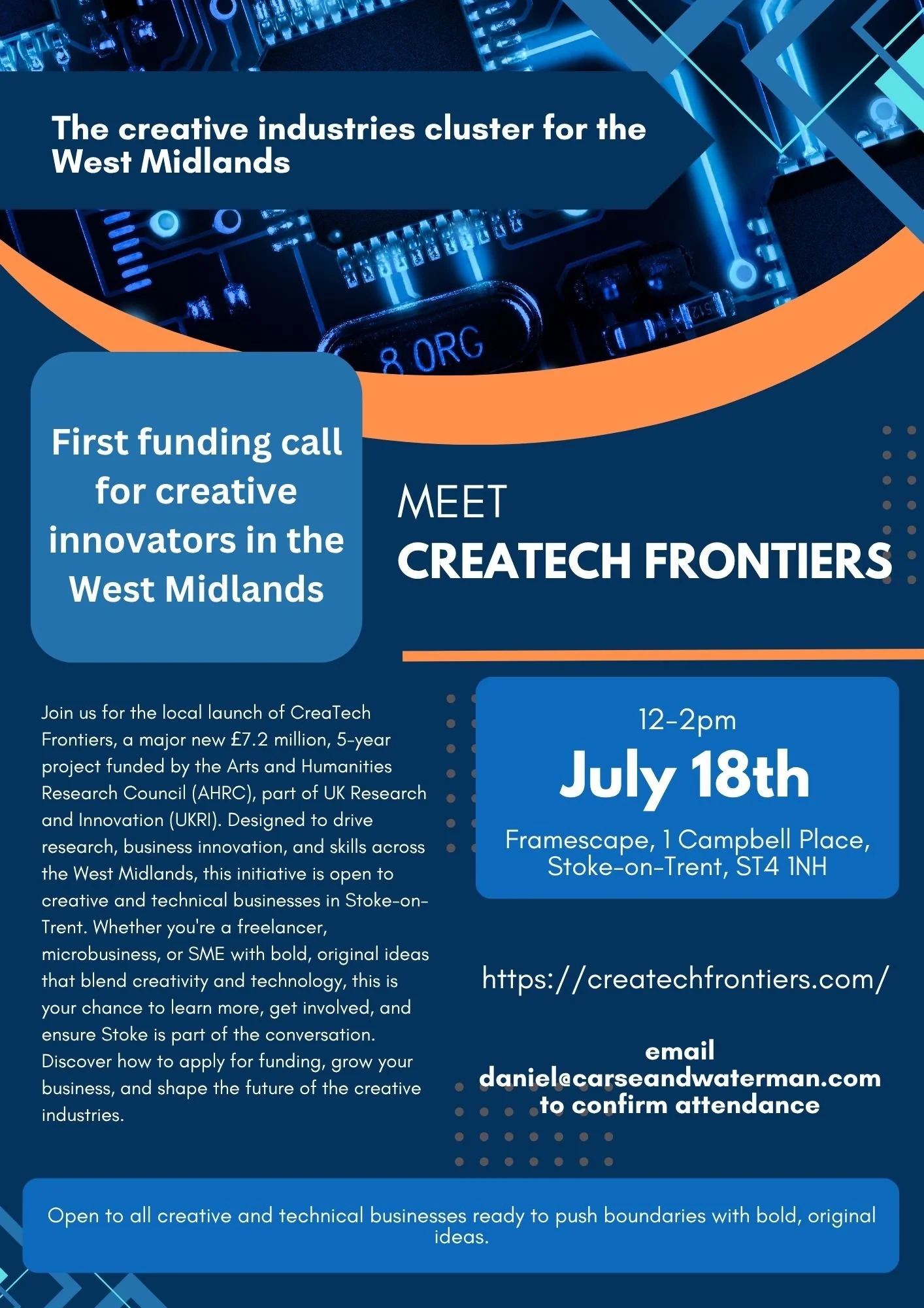 Friday, 18th July, we’re hosting a last-minute but unmissable event with Cretech Frontiers, a forward-thinking academic group backed by £7.2 million in funding from the Arts and Humanities Research Council. Their mission? To grow and support the Createch Cluster in the West Midlands over the next five years.